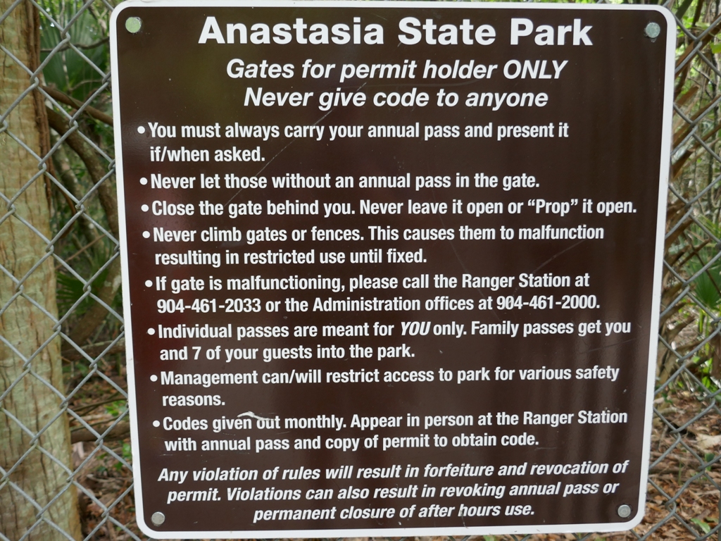 Over the years, access to the park has changed. For many years, San Juan Street just continued into the park; there was no fence or gate. Later a fence was erected and even later a gate to the park was added. For many years now, neighborhood access to the park has been possible with the purchase of a State Park pass. It is understandable that with state revenue covering only 10% of Anastasia State Park’s operating budget and entry fees supporting 90% of operations, why there is now a greater emphasis on following the rules established for using the park. The Park Service also uses appropriate park entry to help ensure public safety.